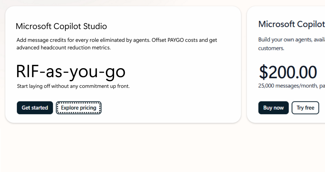 For every employee who successfully automates away their own job using Copilot, your organization will receive bonus Copilot message credits. The more employees you RIF, the more you save. It’s efficiency that pays for itself.” the company said in a press release.